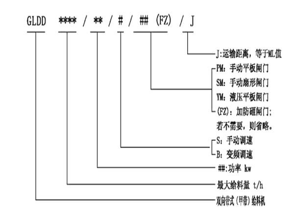 雙向帶式(甲帶)給料機(jī)型號(hào)說明: